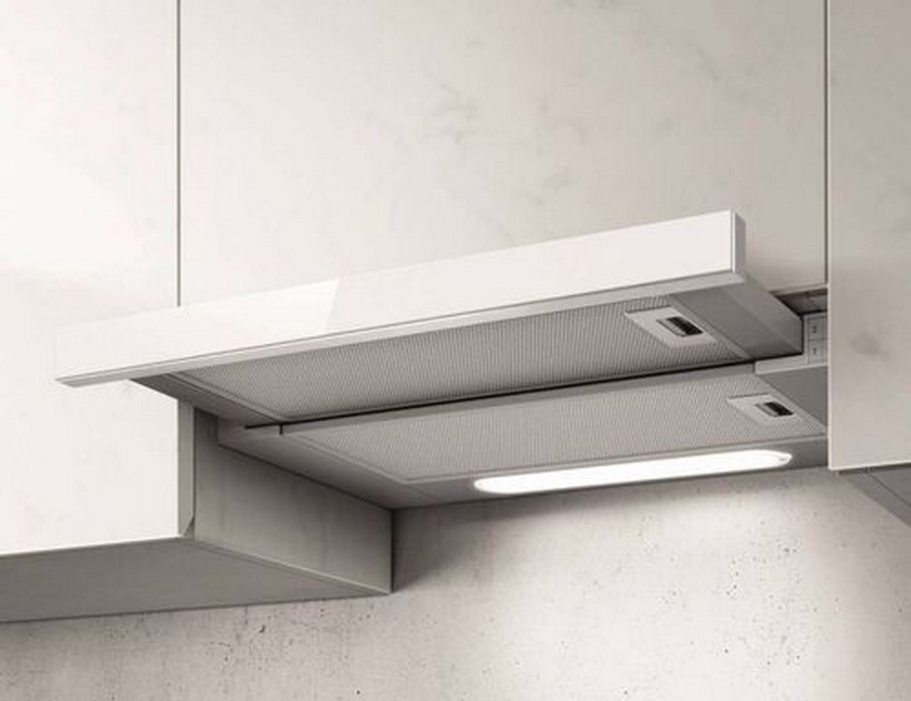 ELICA  ELITE 14 LUX   je výsuvný odsavač par (digestoř), je vyroben z šedého lakovaného kovu + bílé sklo. Odsavač par s výkonem 125-304 m3/h, s hlučností 46-62 db (A).