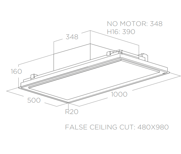 ELICA ILLUSION NO MOTOR @ je stropní odsavač par (digestoř) navržený designérem společnosti ELICA FABRIZIO CRISA. ELICA ILLUSION je vyroben z rámečku z nerezové oceli + středový panel připraven na osazení sádrokartonem. Dálkové ovládání je součástí balení. Samozřejmostí je signalizace nutnosti čištění tukových a uhlíkových filtrů.